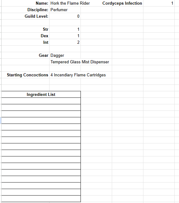 Finally lets get to Character Creation. It’s time to bust out my Google Sheets for this, and it should be very fast! First, we are gonna determine our class. There are 4: Sapper, Assassin, Plague Doc, and Perfumer. Each one has a weapon, a Knack (which they can use to dictate what they find in the field via the Scavenge check), a talent, and their Starting Concoctions that they always being a field mission with. You can choose or roll a d4. I am gonna roll and I get 4 which is the last in the list, a Perfumer. That gives me a Tempered Glass Mist Dispenser (which needs a Concoction to use as fuel), the knack of Injury and Incendiary, and the talent of Blast which says if I use an Incendiary strike in combat, I get +1 to my next attack, once per combat. I start with 4 Incendiary Flame Cartridges, which expel as a fine mist cloud.