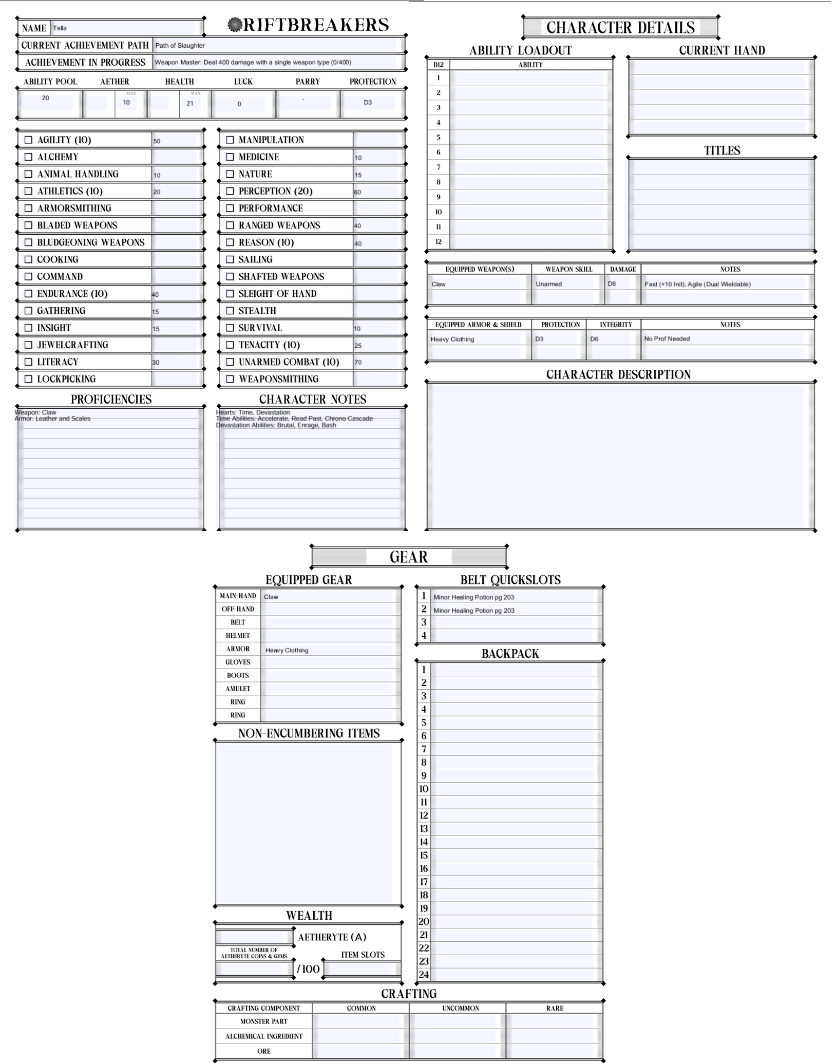I hope you all look forward to this AP. Here is Tella’s current character sheet. Now if you excuse me I need to see about making some cards for my powers and my weapon strikes!