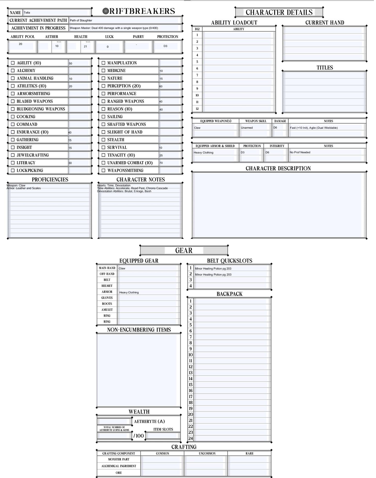 I know from previous experience how important some things are, especially for combat. So one 40 is going into Perception, giving me a 60. I am going to try to go first as often as possible. The other 40 is going in Agility, giving me a 50 there. Gotta be able to dodge. Literacy, Reason, and Endurance get the 30s, giving me a 30 Literacy and 40 in each Reason and Endurance. Tenacity gets one of the 15’s to get 25 there. Gathering, Insight, and Nature get the other 15’s. Athletics gets a 10, for a 20. Survival, Medicine, and Animal Handling get the other 10’s. For Proficiency, Claw is my weapon (it’s the Unarmed type, does Bludgeoning damage), and for Armor I will take Leather and Scales.