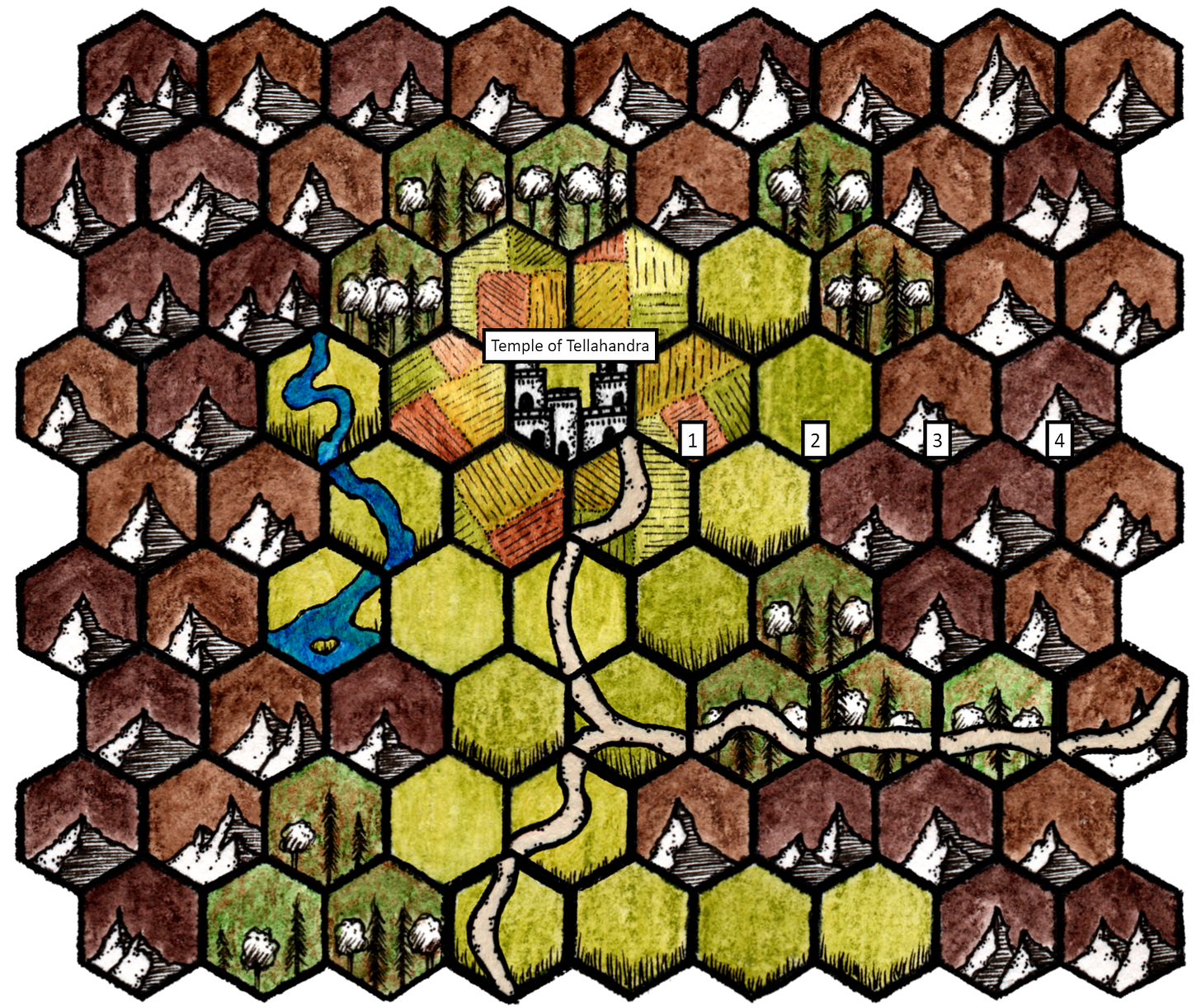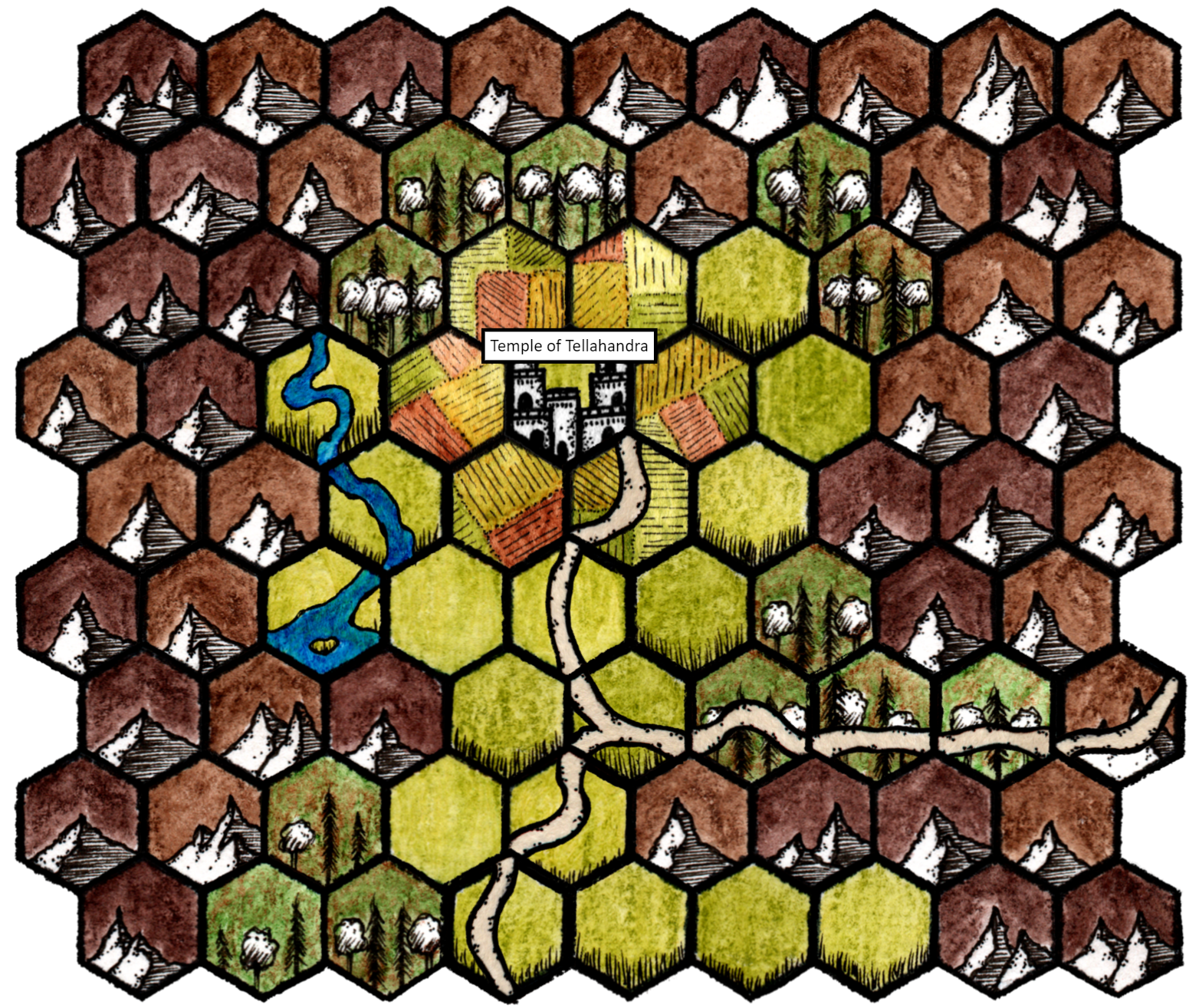 Next, we have to build a hex map of my home region! Now I am not going to roll this up, and instead just use Hex Kit to build a nice valley styled map. Here we go, this is the region around the Temple!